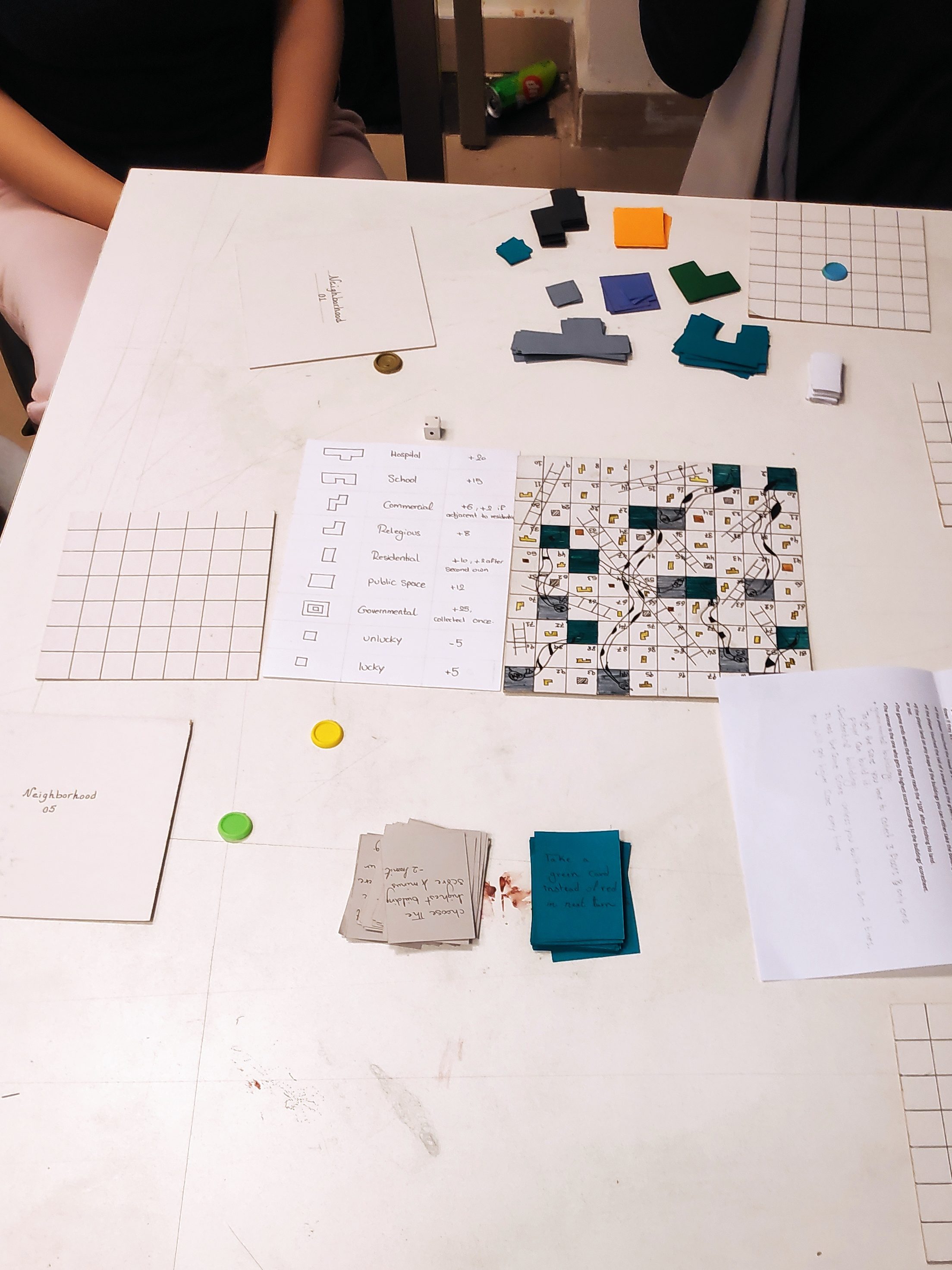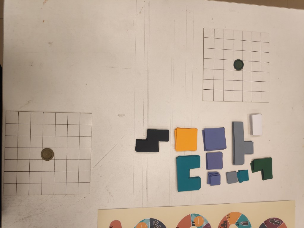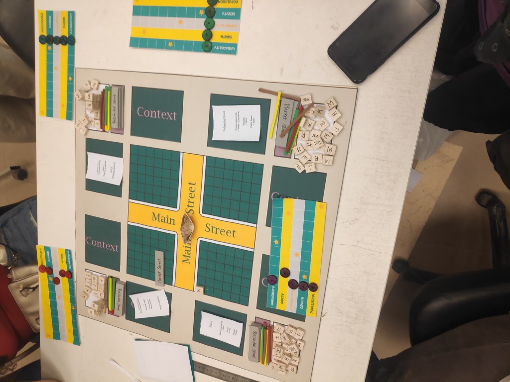 In this game, students a board with hexagon shaped units. They used resource management and dice mechanics to design a competitive board game where players share a common land and they try to build neighbourhoods that gets the highest score.