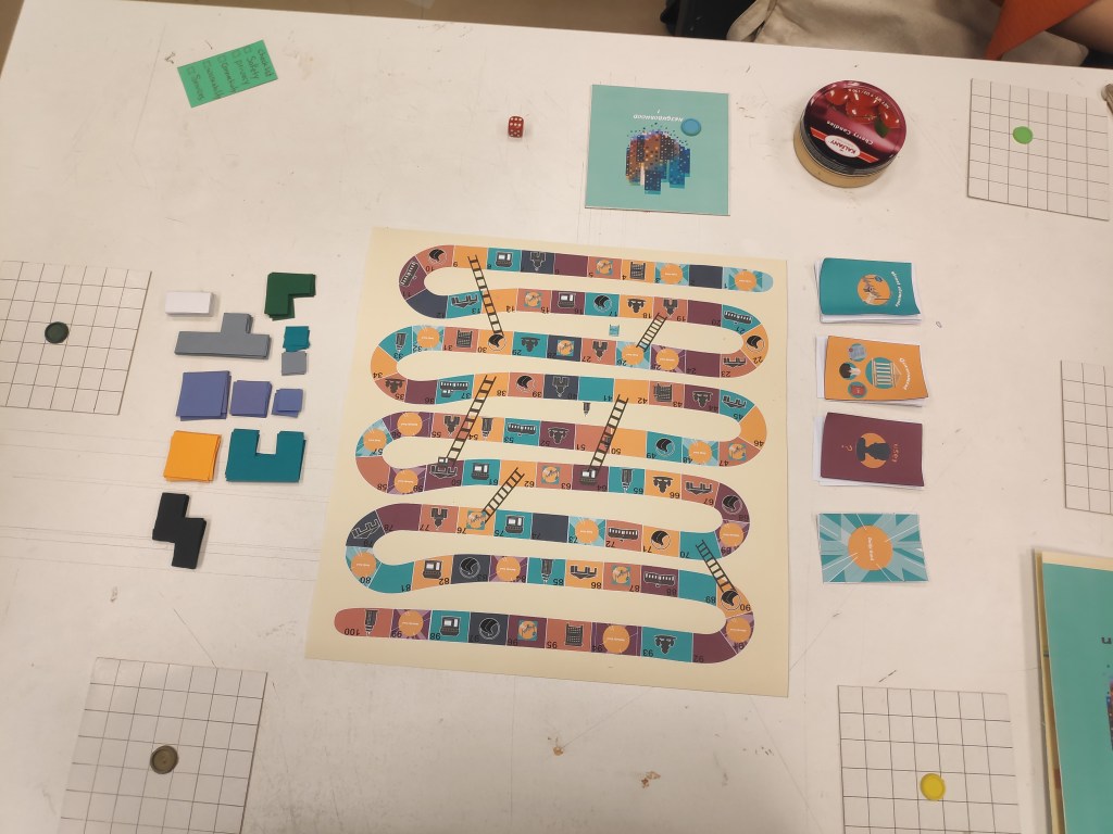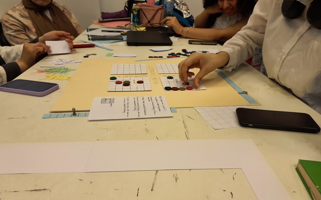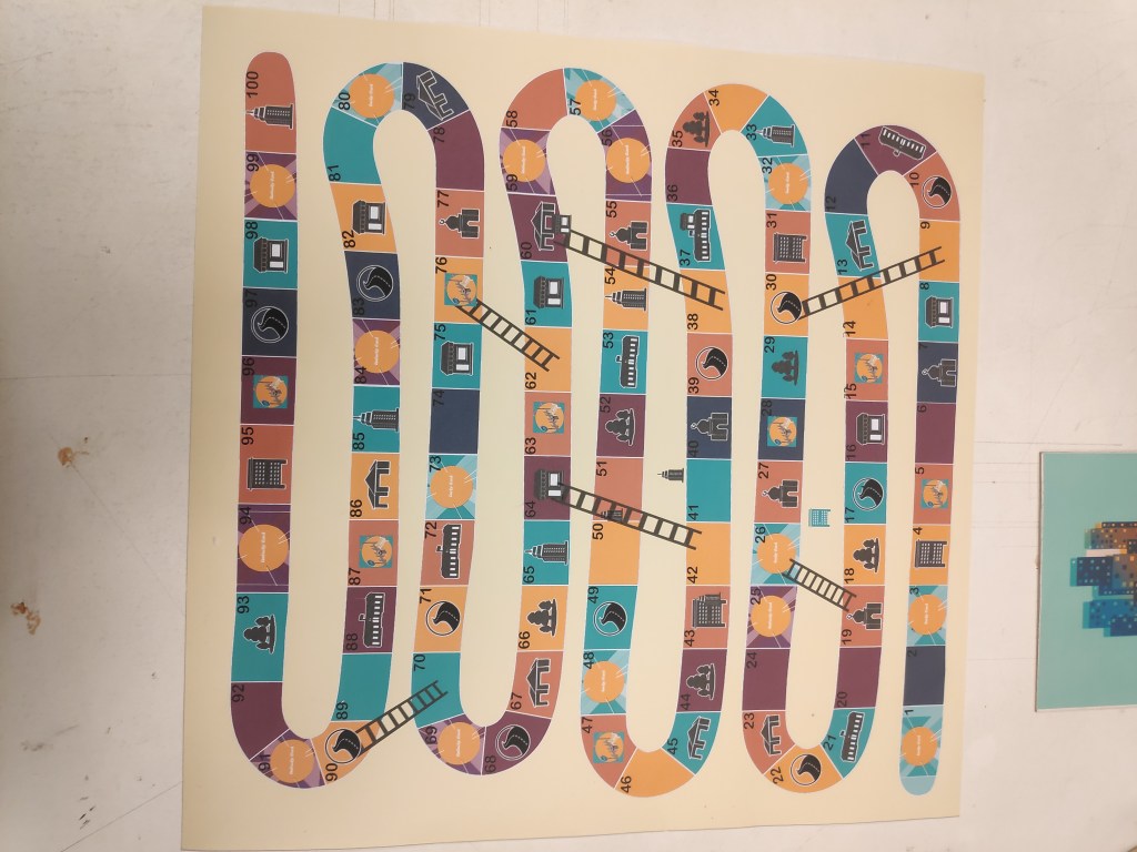 In this game, students divided the snake and ladder board into 4 different neighbourhoods and they used drawing cards and changing rules mechanic to design their own game.