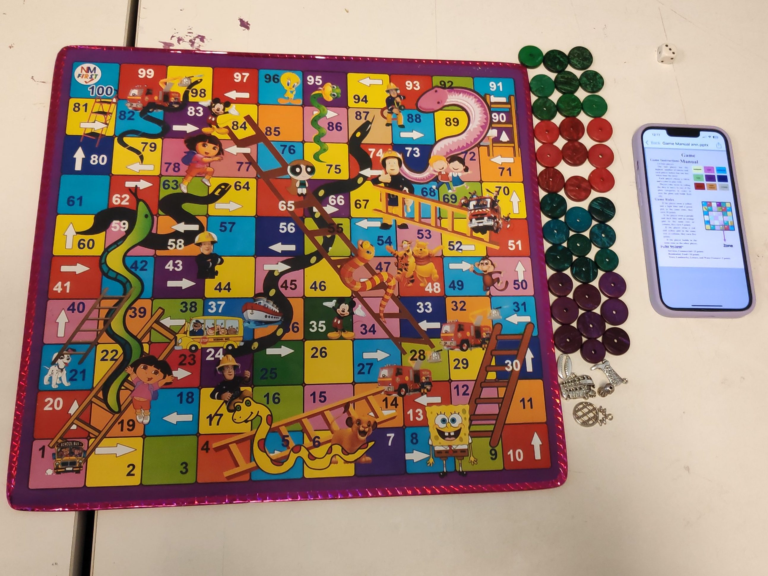 In this game, students used the regular snake and ladder board changing the colours of and shapes of the background of each unit so that they function differently. They also created additional boards for players to place their tiles on in a certain way to make the best use of space.